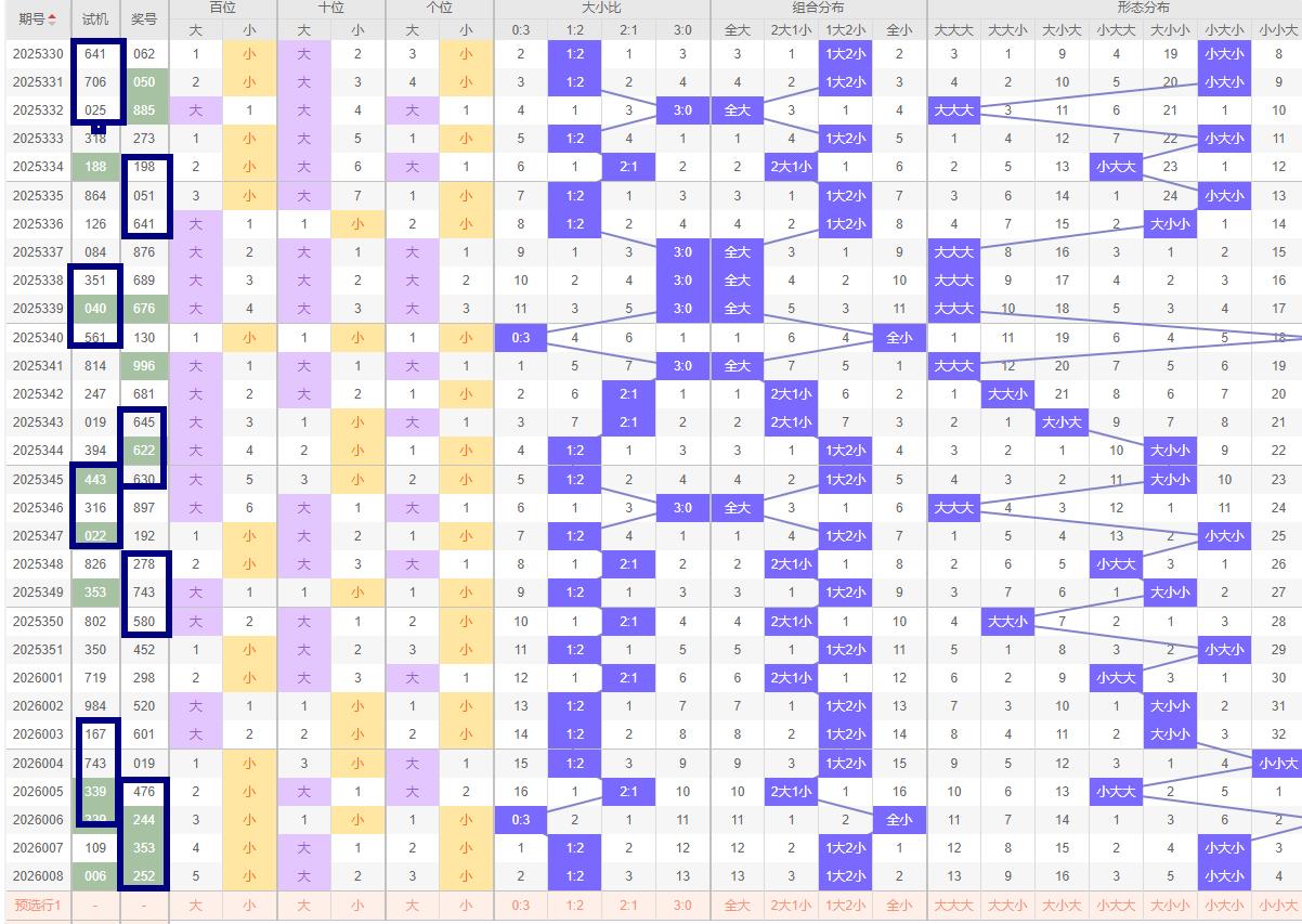 大小走势分析 - 大小比:008期开奖号码252呈现小大小形态,综合近期大小号的波动趋势,建议本期重点关注大小比为2:1或1:2的组合。
