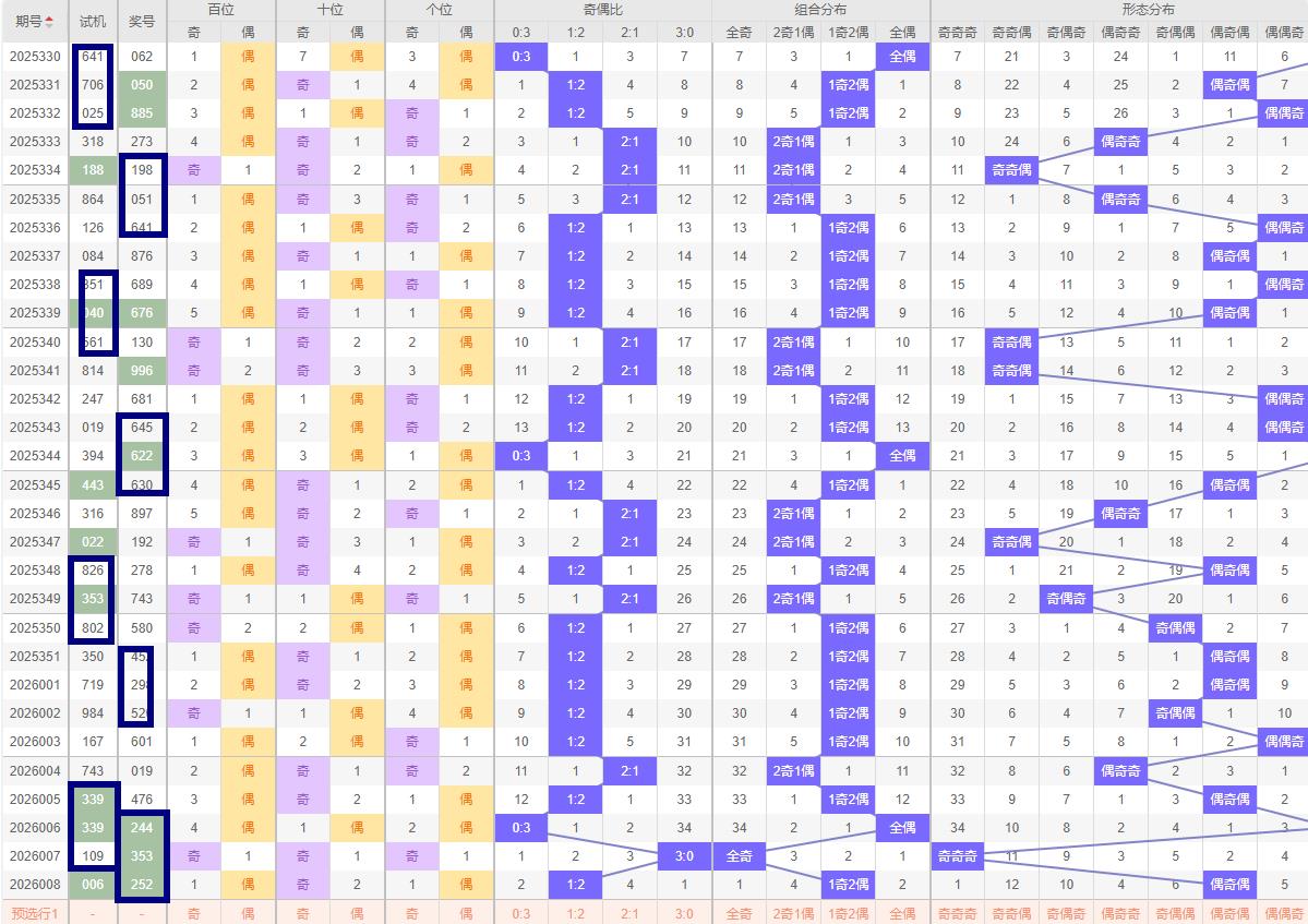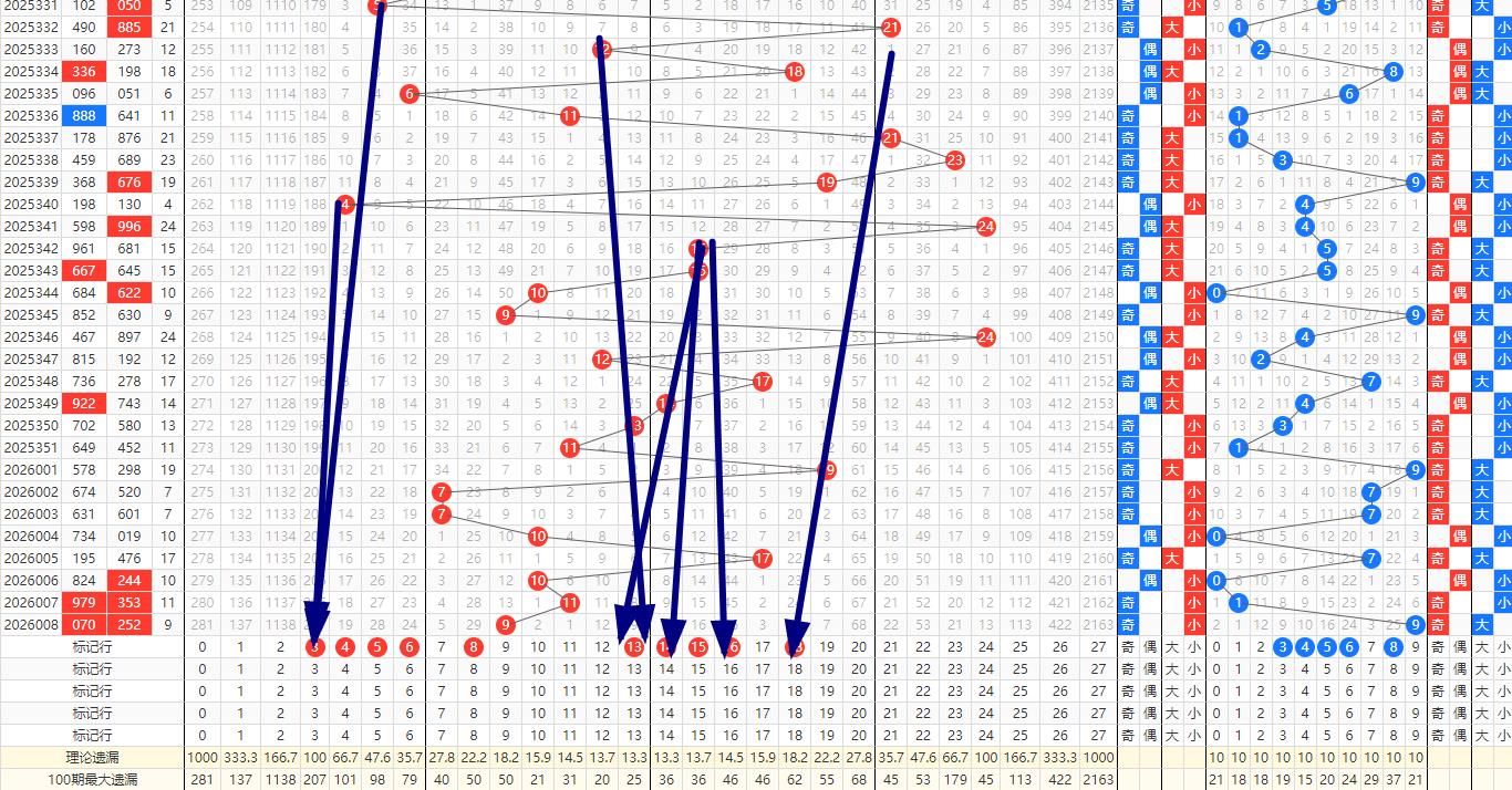 跨度预判 - 跨度:008期开奖号码为252跨度为3,属于小跨度范畴。根据历史跨度数据的统计结果,近十期的跨度为8-3-7-5-6-9-3-2-2-3。012路比为5:1:4因此,本期建议关注.5.6.7.8.路的跨度。特别是跨度.5.6.7.等数值..的跨度
