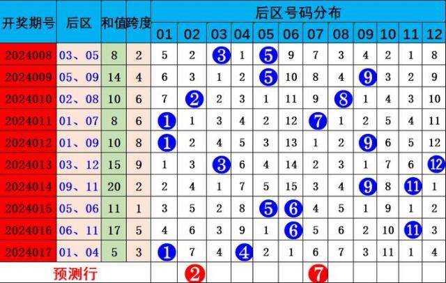 017期开出后区号码:01 04,热热组合。冷热分析:近十期,冷热比6:14,冷号出号较冷,综合分析,本期预测冷冷组合后区回补,关注号码02 03 07 08 12 。精准推荐:02 07。