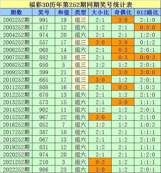 组选类型判断:在第252期历史同期开奖中,组六开出14次,组三开出7次,今年同期看好开出组六号码。