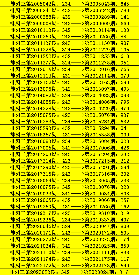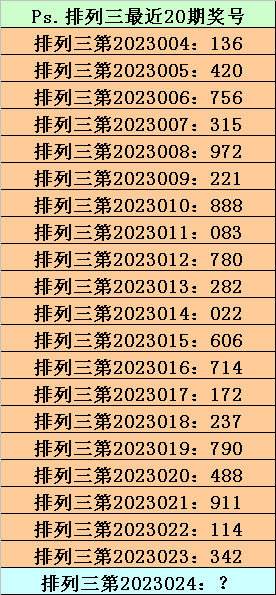 第2023023期排列三奖号为342,历史上该号码组选开出42次,下期奖号分别为:845、789、141、669、130、881、907、105、610、951、765、079、693、493、093、795、474、937、632、041、009、023、426、232、212、694、202、238、328、808、257、162、319、407、809、603、174、859、838、117、546。