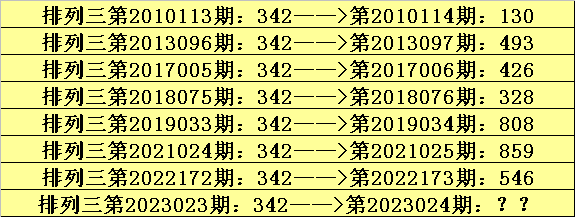 第2023023期排列三奖号为342,历史上该号码直选出现8次,下期奖号分别为:130、493、426、328、808、859、546。