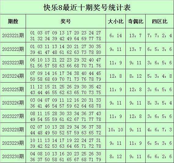 福彩快乐8第2023230期开奖回顾:04 08 10 13 16 20 23 25 26 30 36 37 50 58 61 65 67 68 71 79,其中奖号四区比为6:6:2:6,奇偶比为9:11,大小比为8:12。