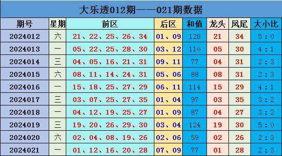 大乐透第2024021期,当期开奖号码为:前区01 12 16 20 28,后区07 09。龙头01,凤尾28,和值77。