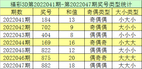 福彩3D第2022047期回顾:奖号为882,奖号奇偶比为0:3,大小比为2:1,和值为18,类型为组三。