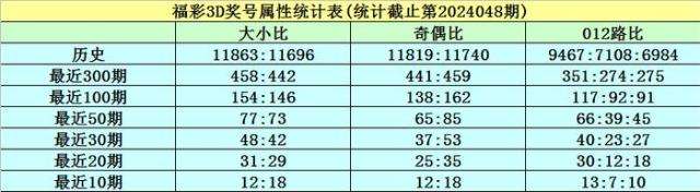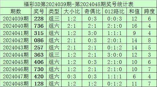 开奖回顾:福彩3D第2024048期奖号为128,其中奖号大小比为1:2,奇偶比为1:2,012路比为0:1:2,和值为11,跨度为7。