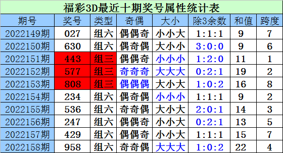 上期回顾:上期开奖奖号为958,类型:组六,奇奇偶,大大大,1:0:2,和值22,跨度4。