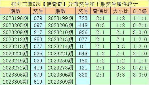 排列三第2023308期奖号为619,直选奇偶分布为:偶奇奇,该奇偶分布历史上共出现了827次,前100期出现8次。