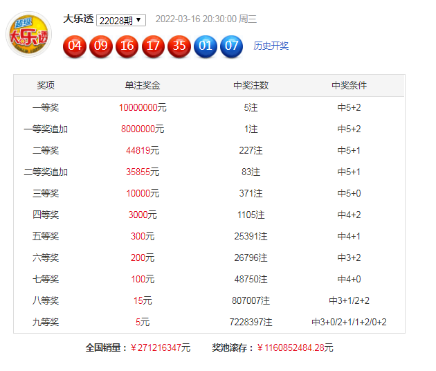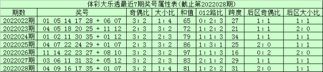 大乐透第2022028期开出奖号为:04、09、16、17、35+01、07。其中前区奇偶比为3:2,三区比为2:2:1,大小比为1:4,后区开出全奇组合。