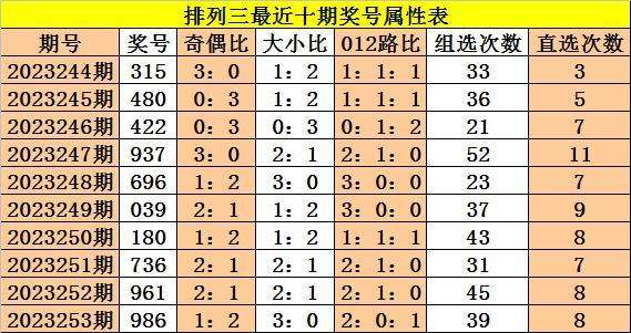上期回顾:体彩排列三第2023253期奖号:986,奇偶比1:2,大小比3:0,012比2:0:1。
