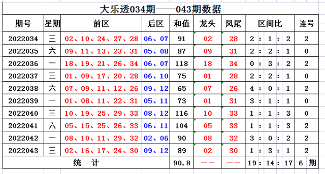 后区开出号码09、12落在3区。最近50期,一区(1-4)开出号码23个,二区(5-8)开出号码38个,三区(9-12)开出号码39个,2、3区号码较热,1区较冷,本期推荐关注:04、11