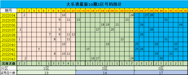 三区(一区1-12,二区13-24,三区25-35)出号个数统计: