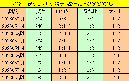 二、体彩排列三前9期奖号开出:714-940-383-364-348-882-108-464-693,其中奖号大小比为11:16,012路比为12:9:6,奇偶比为10:17;