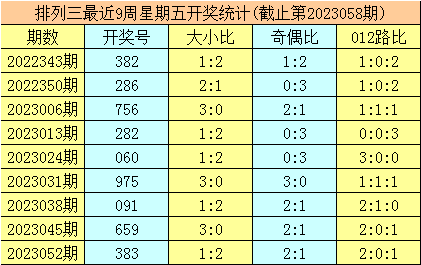三、体彩排列三前9周星期五奖号分别开出:382-286-756-282-060-975-091-659-383,其中号码012路比为13:3:11,奇偶比为12:15,大小比为16:11;