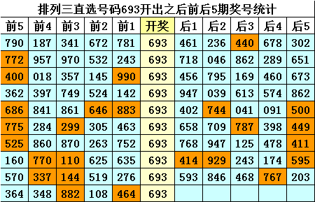 四、排列三直选号码693历史上开出10次,其前后五期奖号分别为: