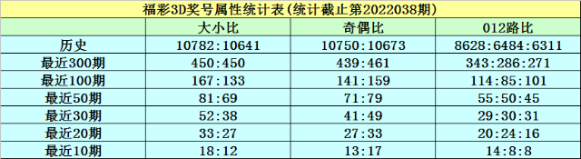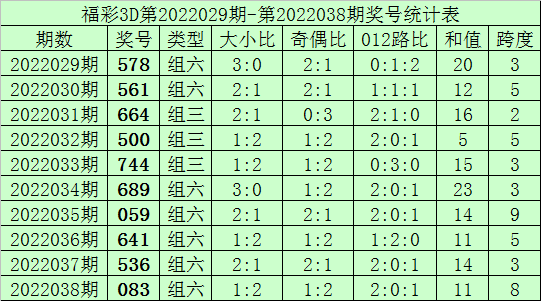 开奖回顾:福彩3D第2022038期奖号为083,其中奖号大小比为1:2,奇偶比为1:2,012路比为2:0:1,和值为11,跨度为8。