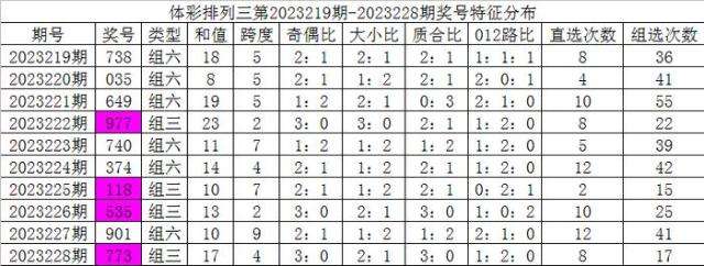 开奖公告:体彩排列三第2023228期开出奖号:773。组三,无重号,奇偶比3:0,大小比2:1,012比1:2:0,和值17,跨度4。