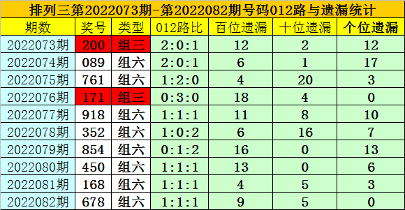跨度分析:在排列三第084期历史同期中,奖号跨度奇偶比为9:8,大小比为8:9,012路比为7:3:7,跨度出现期数为:跨度3→4期,跨度2、5、6→3期,跨度1、4、7、8→1期,跨度0、9→0期,本期预计开出奇数跨度,精选跨度7。
