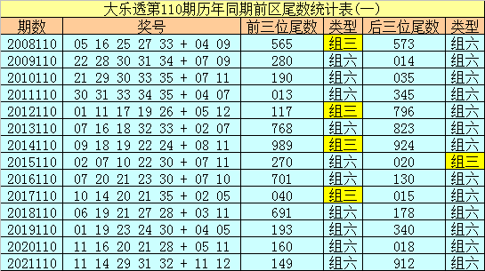 在大乐透第110期历年同期奖号中,前区后三位尾数出号频次分别为:尾数0出现8个,尾数1、3出现6个,尾数2、4、5出现4个,尾数7、8、9出现3个,尾数6出现1个。其中尾数数字三类型豹子、组三、组六次数比为0:1:13,今年同期后三位尾数类型参考组六;