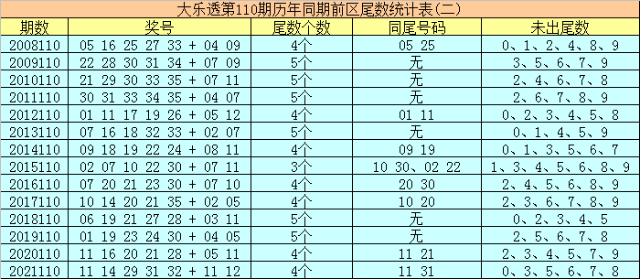 大乐透历年同期第110期后区尾数奇偶比为19:9,最近5年尾数奇偶比为7:3,后区尾数大小比为13:15,最近5年尾数大小比为3:7,本期后区注意号码02、05、08、09、11,后区两码关注02、05。
