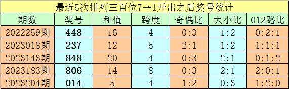 1、排列三最近两期百位号码分别开出7和1,历史上百位号码连续两期分别开出7和1的奖号出现了71期。前五期开出之后其下期奖号分别为:448、237、848、806、014;