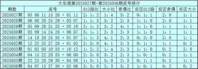 体彩大乐透第25036期奖号为:04 07 13 27 30+02 06,前区奖号012路比为2:3:0,奇偶比为3:2,大小比为2:3,后区1路号码轮空。