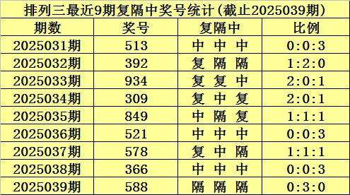 上期回顾:排列三第2025039期奖号为:588。大小比为3:0,奇偶比为1:2,012路比为0:0:3。