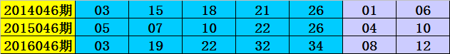 在2014046期-2016046期同周期奖号中,前区连码出现0期,同尾号出现1期,号码奇偶比7:8,大小比9:6,号码012路比5:6:4,前区开出12个号码。