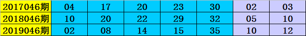 在2017046期-2019046期同周期奖号中,前区连码出现1期,同尾号出现3期,号码奇偶比5:10,大小比8:7,号码012路比2:3:10,前区开出14个号码。