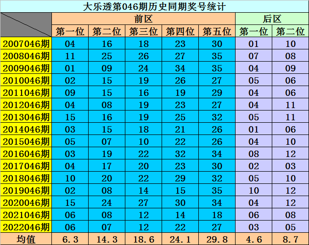 在2020046期-2022046期同周期奖号中,前区连码出现1期,同尾号出现3期,号码奇偶比4:11,大小比7:8,号码012路比10:3:2,前区开出12个号码。