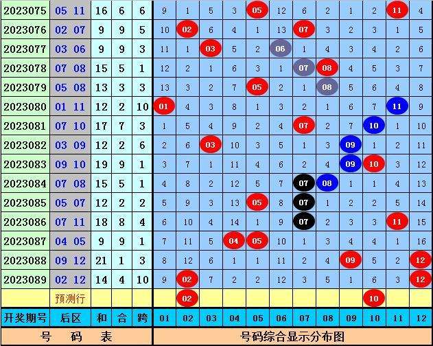 后区分析(一区01-04,二区05-08,三区09-12):上期后区开出奖号02和12,最近10期后区三区落号比为4:11:9,本期后区关注号码02、03、06、10、12,后区两码参考02、10。