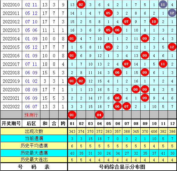 后区上期开出奖号:06+07,前6次后区奖号06+07出现之后,其下期分别开出号码:02+11、08+11、06+12、03+06、01+11、07+10,本期后区注意五码01 03 04 10,单挑两码01 04。