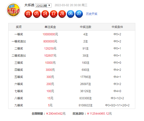 上期开奖:大乐透第2022022期开奖号码为:01 05 14 17 28 +06、07,各位号码遗漏值分别为:2 9 4 1 22 + 0 4。
