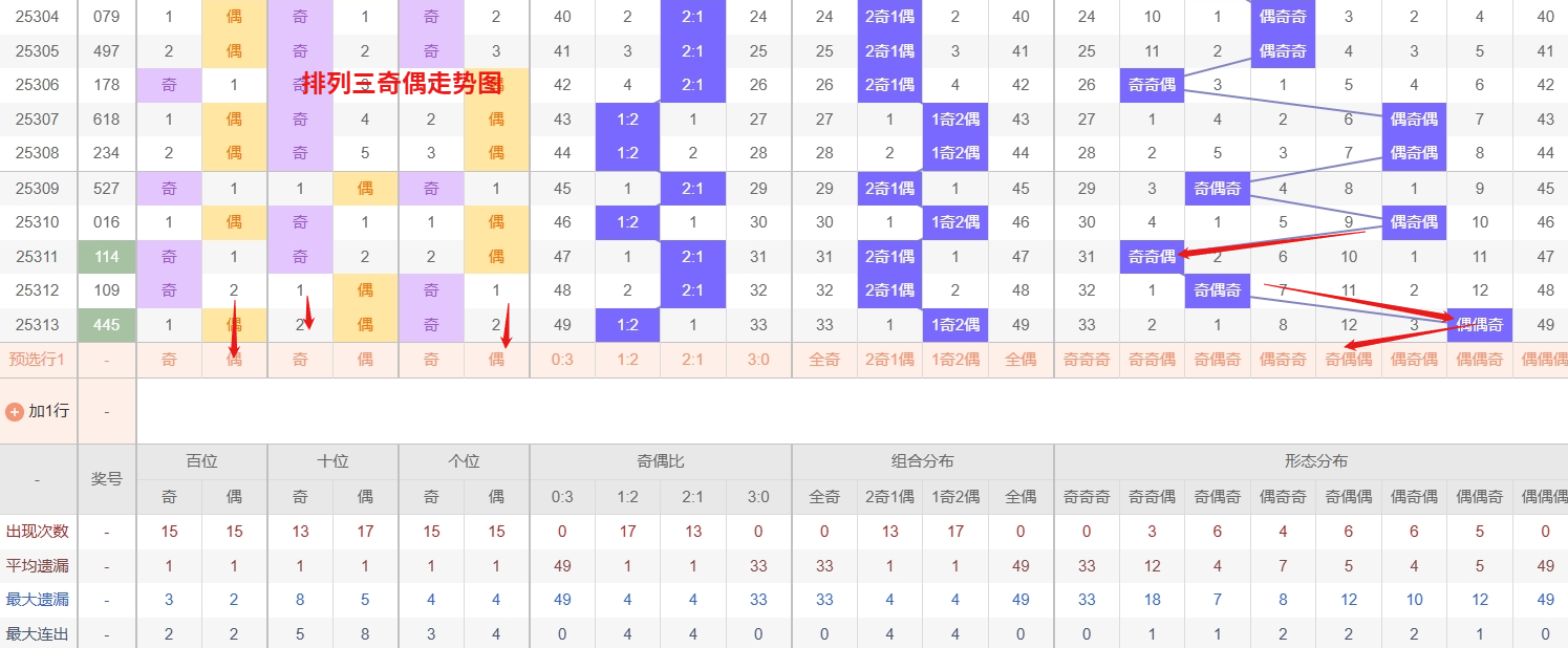 排列三 奇偶分析:从上图可以看出排列三100期内百位奇偶比约为52比48,十位奇偶比为46比54,个位奇偶比为47比53,百位的比值比较均衡,但是十位的比值偏差就有点大,历史奇偶形态近2期开出偶偶奇后下一期的走势为,第234期开出偶偶奇后235期开奇偶偶, 第248期开出偶偶奇后第249期开偶偶偶,第253期开出偶偶奇后第254期开奇奇奇,排列三近期的奇偶走势分析,呈现出明显的“冷热分化”格局。一方面,“奇偶偶”作为当前的热门形态,其强劲的势头尚未减弱,存在连续开出的可能性,应作为重点关注对象。另一方面,须警惕极端形态的回补,“奇奇奇”已遗漏长达33期,而更为冰冷的“偶偶偶”更是长达49期未见踪影,这两种全奇或全偶的组合其理论上的开出概率正在急剧累积,冷到极致必然转热,随时可能破冰而出。因此,在当前的选号策略上,我们既要顺势而为跟进热号,更要对这些深冷形态严加防范,所以排列三2025314期奇偶形态推奇偶偶与奇奇奇。本文由彩虹多多钱是生命动力所著,请勿转载