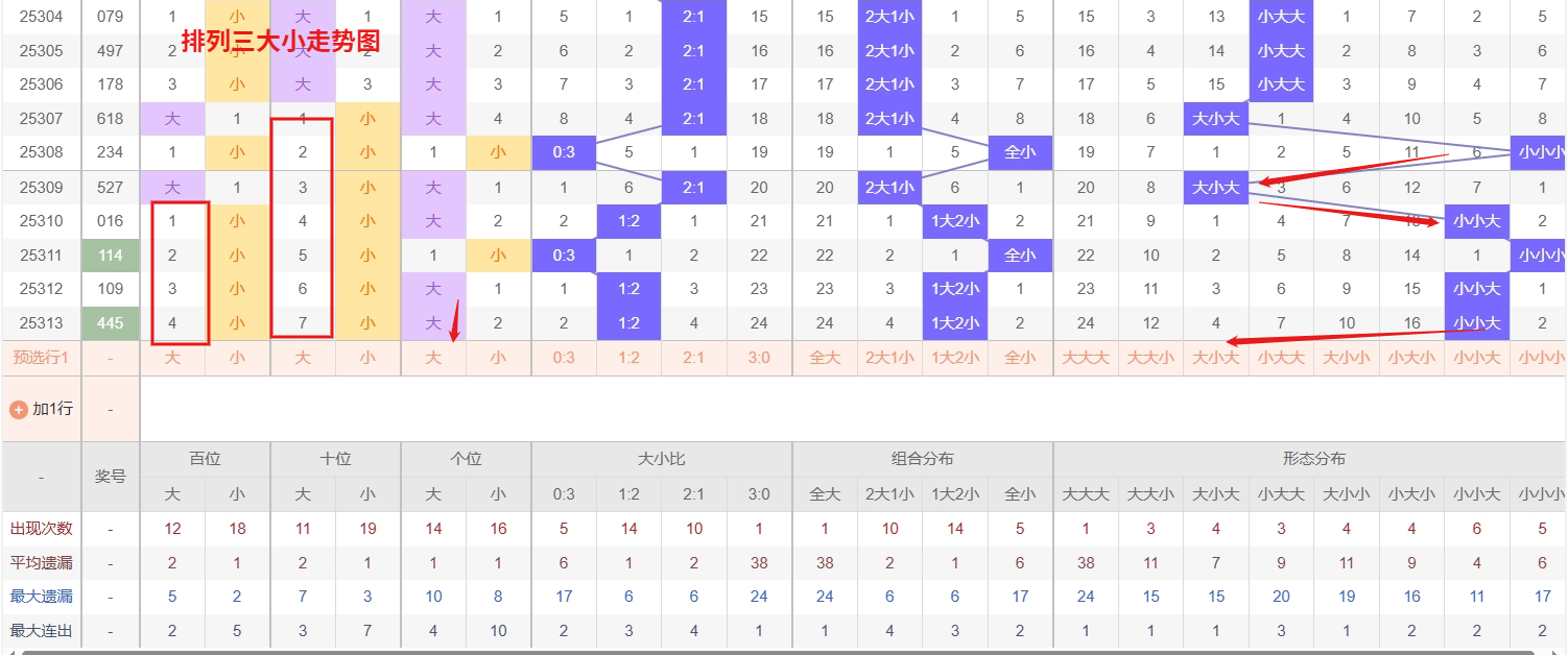 排列三 大小形态分析:从大小走势图上可以看出排列三100期内百位大小比约为53比47,十位大小比约为46:54,个位大小比约为51比49,除了个位和百位奇数比偶数多,十位是偶数比奇数多。历史数据近2期开出小小大下一期的走势为,第243期开出小小大第244期开大大大。第255期开出小小大后第256期开小大小,第266期开出小小大后267期开大小小。排列三近期的大小走势分析,“小大小”与“大小小”组合表现活跃,已成为当前的热门形态,其强劲势头预计将持续,存在连续开出的可能,值得作为重点关注对象。与此同时,须警惕“大大大”这一全大形态的冷态回补,该组合已遗漏多期,其理论开出概率正不断累积,冷极转热的趋势日益明显,随时可能强势反弹。因此,采取攻守兼备的思路,既要顺势追踪热号,也务必对深冷形态严加防范,所以排列三第2025314期大小形态推荐小大小防大大大。本文由彩虹多多钱是生命动力所著,请勿转载