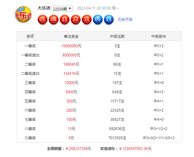 上期开奖:大乐透第2022039期开奖号码为:01 08 11 22 31 +05、11,各位号码遗漏值分别为:1 5 0 12 3 + 3 15。