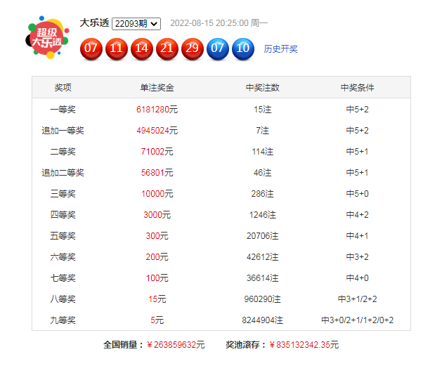 大乐透第2022093期开奖,前区:07、11、14、21、29;后区:07、10。其中前区奖号012路比为1:1:3,大小比为2:3,奇偶比为4:1,后区为全1路组合。