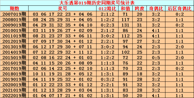 综上所述,大乐透第2023019期前区012路比参考1:2:2。