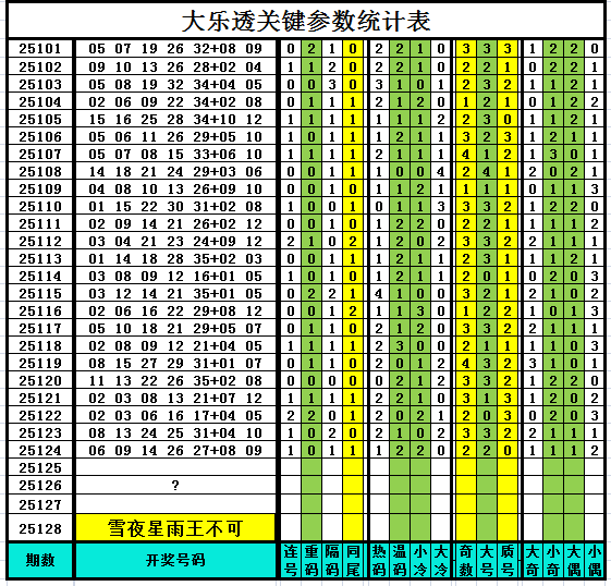 以下是作者手工统计的大乐透关键参数统计表,对喜欢参数分析、过滤缩水、选号胆杀的技术性大乐透爱好者有所帮助,其它读者可略过不看。