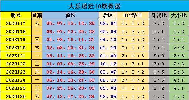 大乐透第2023126期开奖。当期开奖号码为:前区07 12 17 26 34,后区02 06。当期前区号码012路比1:2:2,奇偶比为2:3,大小比为2:3。
