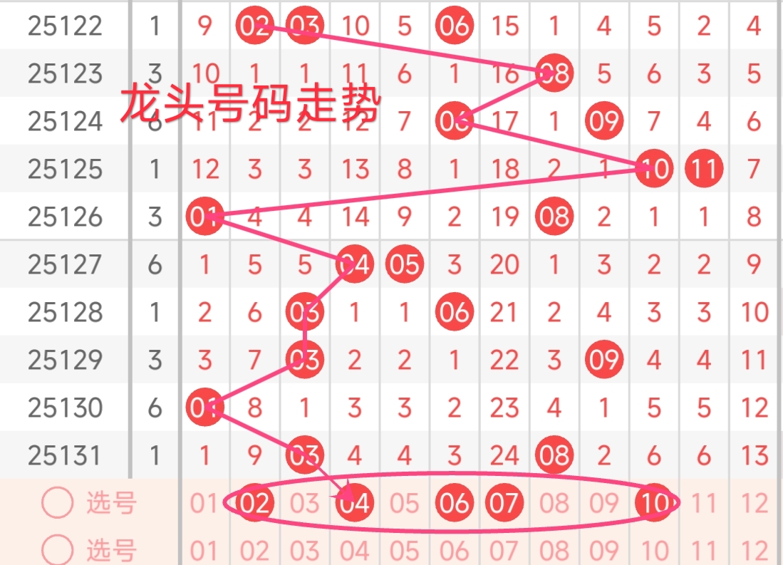 上期龙头号码为03,振幅上升了2点,开出奇数号码。从近期龙头号码的走势来看,近期龙头号码波动频繁。上期龙头为03,为奇数号码。从近期龙头走势来看,历史龙头号码走势,其奇偶性交替出现,且龙头号码分布在01 - 10这个范围内。综合考虑,本期龙头号码倾向于偶数,因为偶数在近期的龙头号码中出现频率相对较低,按照概率和走势规律,本期有较大可能出现偶数龙头。本期还需注意连续多期漏出的号码,需重点关注,有回补龙头号码的趋势。 综合考虑,本期龙头号码推荐关注:02、04、06、07、10。