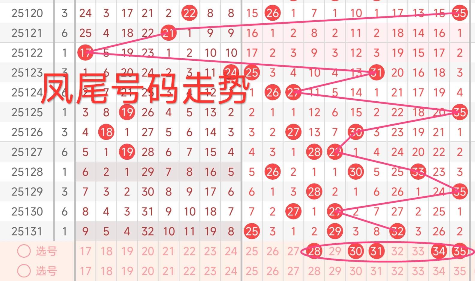 红球三区推荐(25~35):上期红三区开出3枚号码,号码为25、29、32,本期红三区建议出号1-2枚,本期红三区推荐关注号28、30、31、34、35。