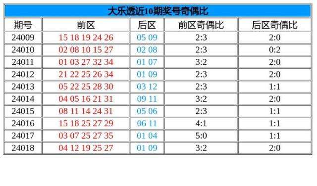 首先我们先来回顾一下上期的大乐透开奖。体彩大乐透第24018期奖号开出:04 12 19 25 27 + 01 09,其中5个前区号码的奇偶比为3:2,2个后区号码的奇偶比为2:0。