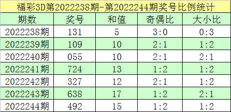 福彩3D第2022244期回顾:奖号为492,奖号奇偶比为1:2,大小比为1:2,和值为15,类型为组六。