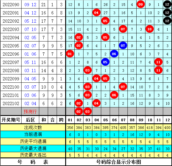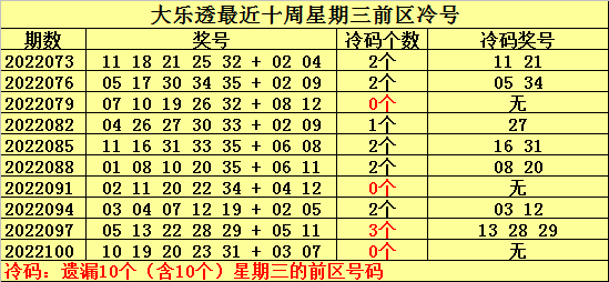 冷号:最近十周星期三前区开出14个冷号,上周星期三冷号轮空,本周星期三放弃冷号出现的可能。
