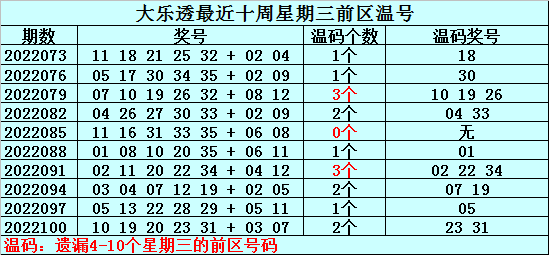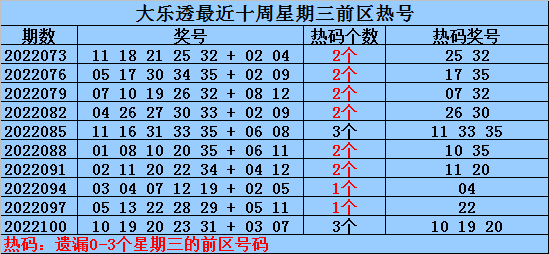 热号:最近十周星期三前区开出20个热号,上周星期三前区开出3个热号,本周星期三注意热号03 34。