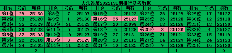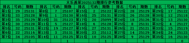 超级大乐透前区是从01-35的号码中每期开出5个号码,把历史数据按照出现次数排行后分成五个区,每个区7个号码,前二位的号码是热位号,中三位的号码是温位号,后二位的号码是冷位号,理论上每个区每期是开1个号码,对比最近开出的数据分析: