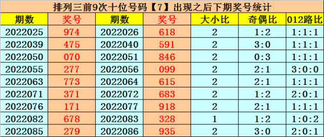 在十位前9次出现号码7后,其下期奖号分别开出:1-9-4-9-1-8-1-2-3,其中奖号个数奇偶比是6:3,大小比是3:6,012路比是3:4:2。
