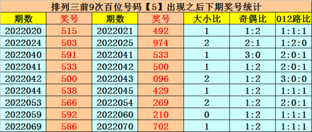 在百位前9次出现号码5之后,下期百位分别开出奖号:4-9-5-5-0-4-2-2-7,其中开出号码个数奇偶比是4:5,大小比是4:5,012路比是2:3:4。