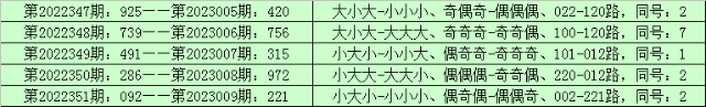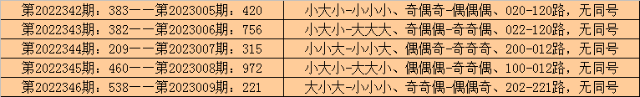 所以,排列三第2022347期奖号:925,与排列三第2023010期奖号可能没有同号。且排列三第2023010期奖号大小比、奇偶比和012路比不会与第2022347期奖号直选形态:大小大、奇偶奇和022路全部相同。